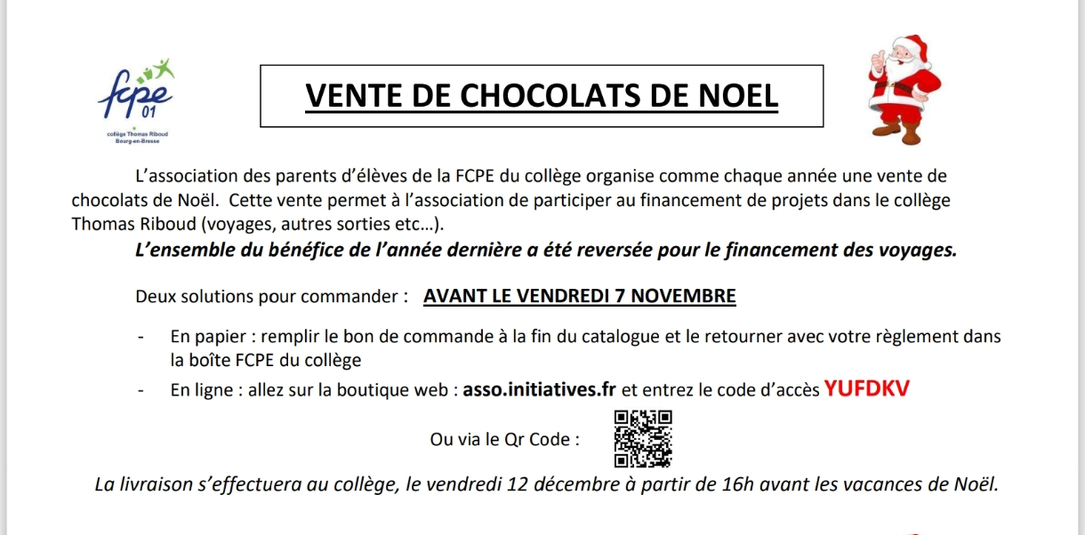 L'association de parents d'élèves FCPE organise une vente de chocolats de Noël.